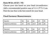 Choose your size based on your head circumference. Add a recommended positive ease of 3-5 cm (1.2"-1.9"). Pick the size that is the best match for your head.