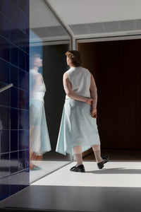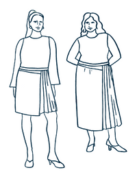 Buy the Kirsti Skirt sewing pattern from TAUKO. Kirsti by Stefanie Kroth is an asymmetrical skirt with a side godet and pleats. You can make it in two lengths – mini or midi – or adjust the length to suit you. It has a zip at the side and two darts at the back.