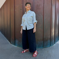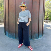 Buy the Alba Pants sewing pattern from Tessuti Fabrics. These stylish trousers feature wide, cropped legs with a subtly curved silhouette. The comfortable mid-rise waist has a unique faced flat front with an elasticated back. The single button, fly front closure and back yokes give a neat, fitted hip and minimal waist gathers. The curved inset front pockets, single rear patch pocket, back yokes, side seams and hems are all topstitched and look great when highlighted in contrast thread.