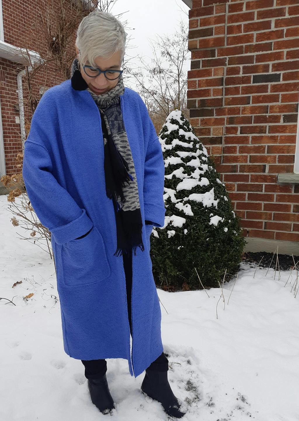 Buy the Florence Coat sewing pattern from Tessuti Fabrics. This longline, oversized, unlined coat has a relaxed style. It features a collarless neckline with a stitched-down facing, dropped shoulders, patch pockets, and full-length sleeves with turned back cuffs. The coat front sits edge-to-edge without overlap, making it the perfect lightweight layering piece for the autumn/winter months. As the seams are overlapped and the edges and hems left raw, the Florence Coat is best made up in boiled or felted wools that do not fray when cut.
