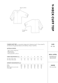Buy the V-neck Cuff Top sewing pattern from The Assembly Line. The V-neck Cuff Top is a minimalistic design with a bohemian touch. It has a loose fit and features full, gathered sleeves contrasted with a sharp V-neckline.