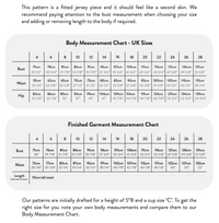 Sizing: UK 4 – 28 (approx. UK 4/6 – 26, based on our standardised size chart). Please also check the designer's size chart and finished garment measurements.