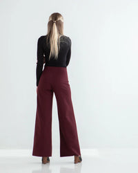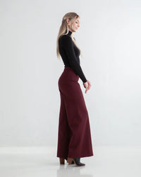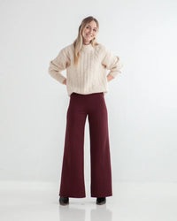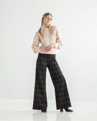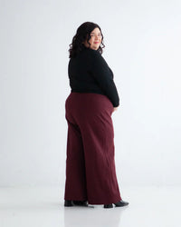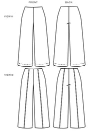 Buy the Ayla Pant sewing pattern from True Bias. Ayla is a pull-on knit pant with wide legs and two views. Both views are fitted through the waist and hips and include a wide elastic waistband. View B has panelling along the front and back legs and topstitching to accentuate the details. Both views have a high-waisted fit and an approximate 30 inch inseam.