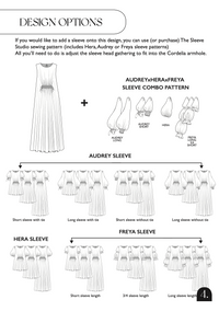 Note: CORDELIA IS SLEEVELESS. But you can add sleeves using the Audrey, Hera, and Freya sleeve patterns (available to purchase together here). All you'll need to do is adjust the sleeve head gathering to fit the Cordelia armhole.