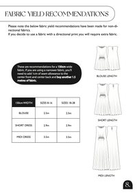 150 cm wide fabric: Blouse, 2.5 m // Short dress, 2.9 m // Midi dress, 3.5 m.