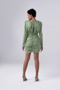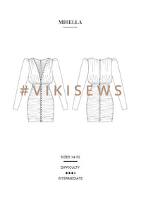 Buy the Mirella Dress sewing pattern from Vikisews. Mirella is a close-fitting lined dress with an accentuated waist. The waist seam is curved and sits above the natural waistline. The dress has an extended shoulder line with shoulder pads and long set-in sleeves gathered at the top along the sleeve cap. The bodice features vertical gathers on both the front and back. Mirella has a deep V-neckline decorated with rouleau loops on the right and buttons on the left. The back bodice features a keyhole down to the waistline, which fastens with a rouleau loop and button. A straight-cut skirt features horizontal gathers. The front seam is decorated with rouleau loops and buttons continuing down from the neckline. Mirella fastens with an invisible zipper in the centre seam of the back skirt and is above-knee length.