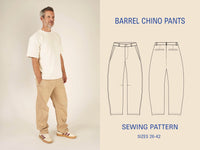 Buy the Men's Barrel Chino Pants sewing pattern from Wardrobe by Me. These trousers combine a modern silhouette with timeless menswear details. They feature a relaxed barrel leg, shaped waistband with belt loops, fly front zipper, side pockets, and back welt pockets. Perfect for everyday wear, dress them up with a shirt and blazer or keep them casual with a tee and sneakers.